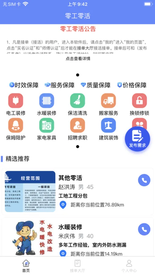 零工零活APP是在线找零活、找家政、找保姆、找月嫂和保洁、钟点工、小时工等服务,同时提供用户在线发布自身需求等服务。零工零活APP能够实现需求发布,服务接单,用户支付、获取当前定位、订单流程跟踪、上门服务等功能,用户可以通过分享邀请码确认团队关系获取更多收入。同时提供配套服务端功能,服务端提供接单、订单管理、在线结算、上门服务等功能。
