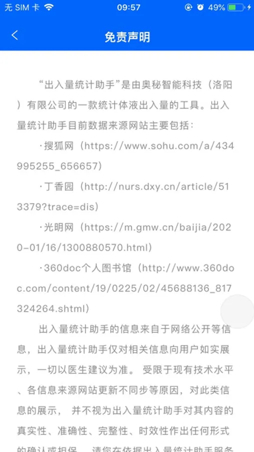 出入量统计助手提供体液出入量及体重的日常记录和统计,可对体重变化异常进行设置阈值、监测和APP报警,支持查看体重和出入量历史操作记录和统计图表,支持自定义出入量项目和出入量数据导出Excel,方便了解用户体液出入情况。本APP由非医疗机构提供,所有医疗知识最终以专业医生指导建议为准。