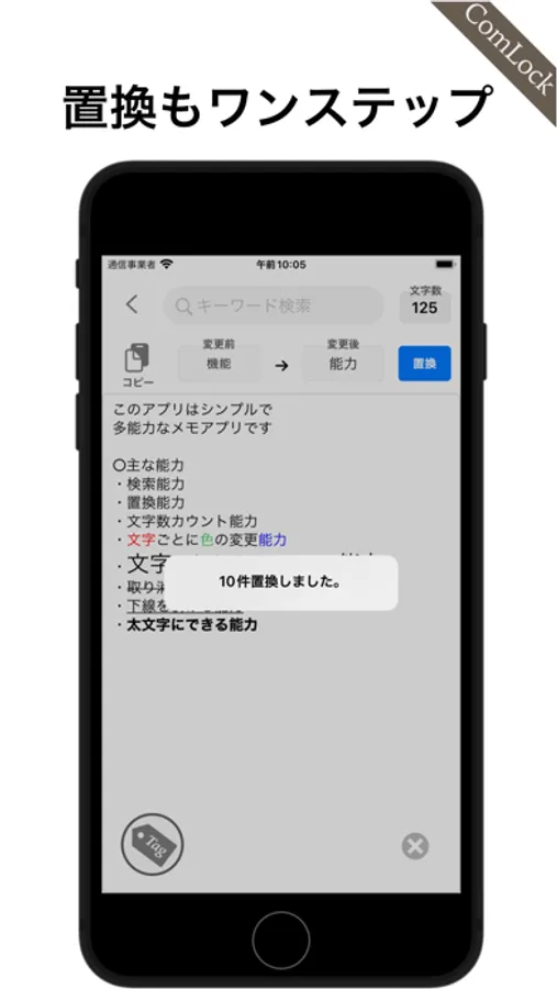 メモ内の文章の中から対象の文字を別の文字に置き換えることができます。