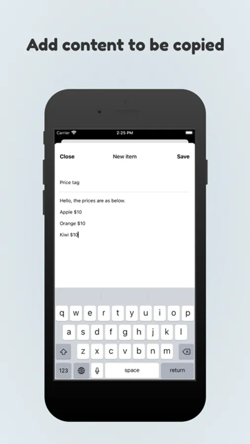 Add frequently used content, and click an item to save it to the clipboard.