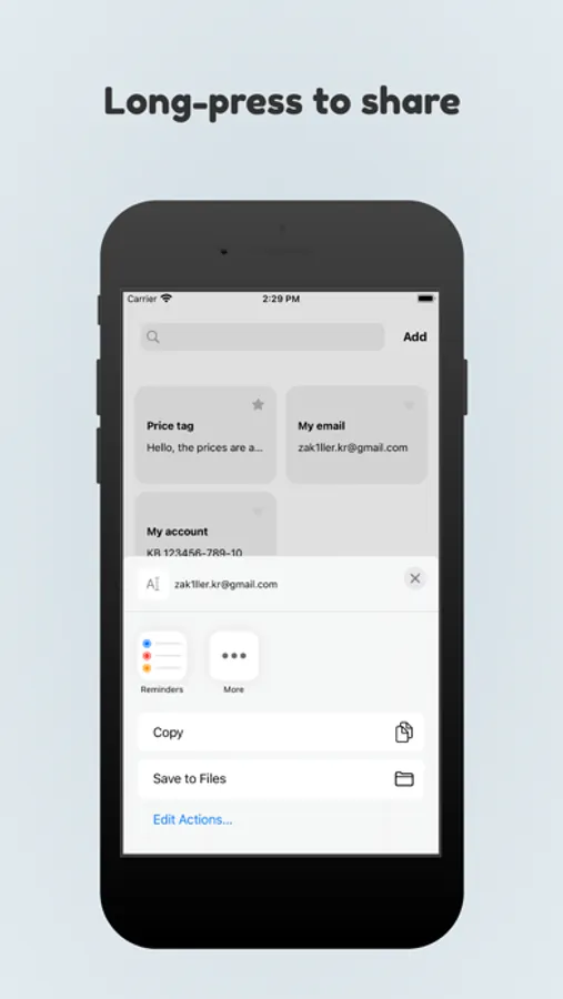 Long-press an item to edit, delete, and share functions.