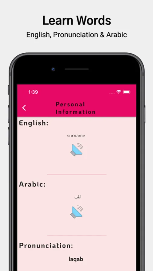 • In every lesson, you can listen to the Arabic word pronunciation as well as see Arabic word in english language.