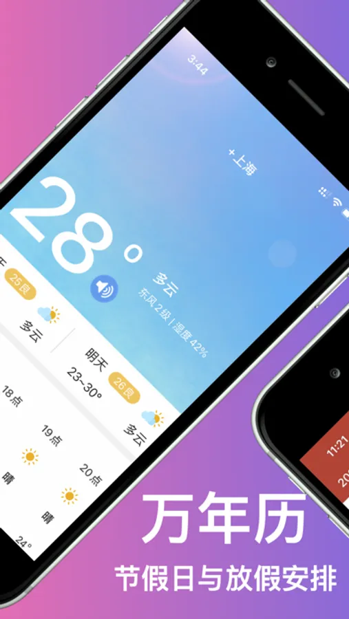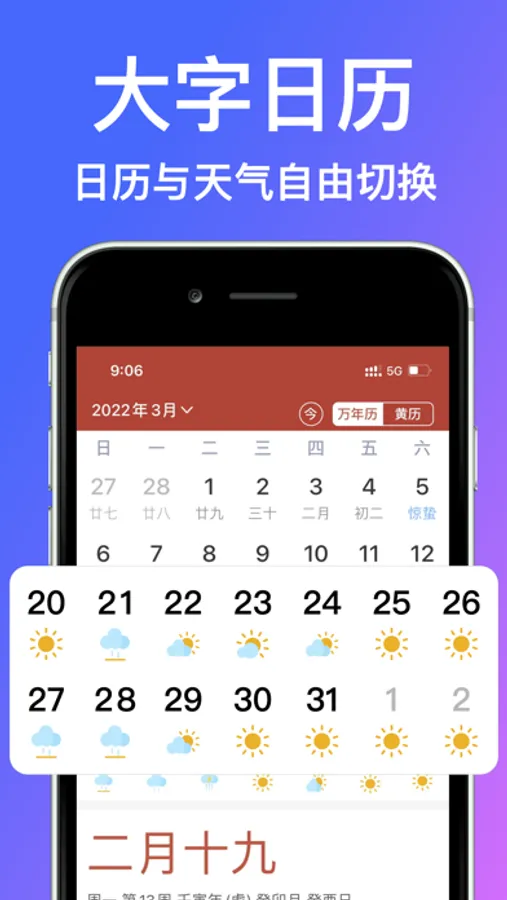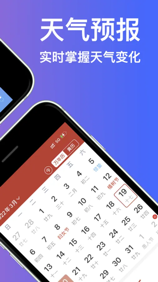 ①万年历:阴历阳历、放假、节日节气,天气万年历模式;