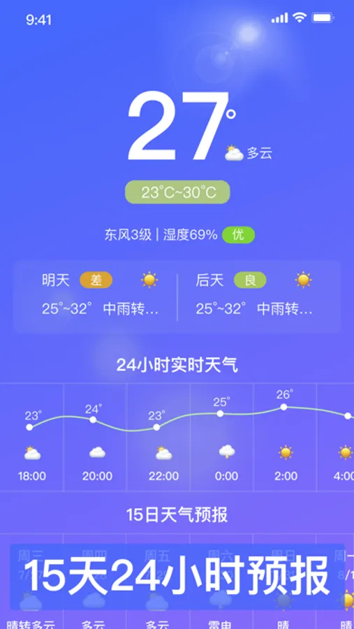 ②天气:查看24小时实时天气、未来15天天气预报、PM2.5污染提示、紫外线强度、穿衣建议;