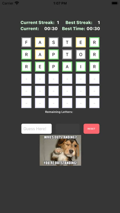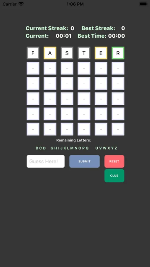After you enter each guess, click 'Submit' button. Note the word actually has to be real! Clicking the 'Reset' button will allow you to start over, but it will also reset your streak. Clicking the 'Clue' button will give you a random clue to help solve the word.