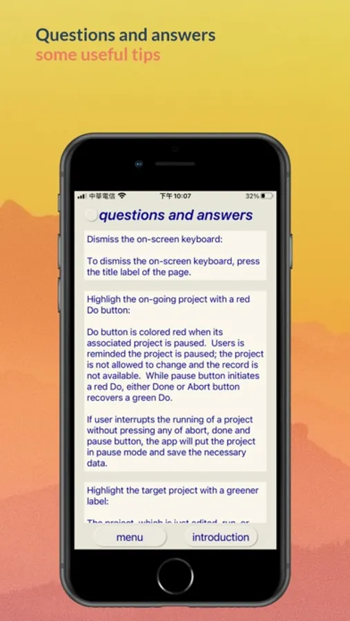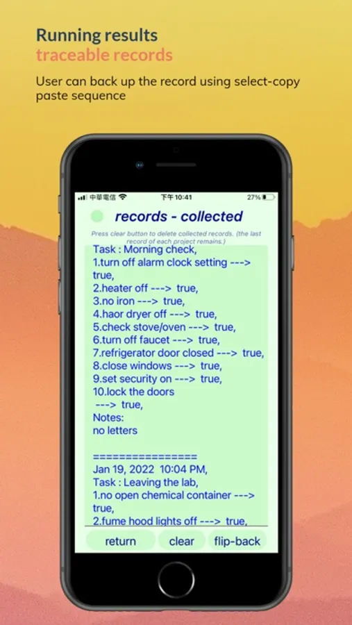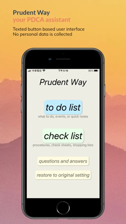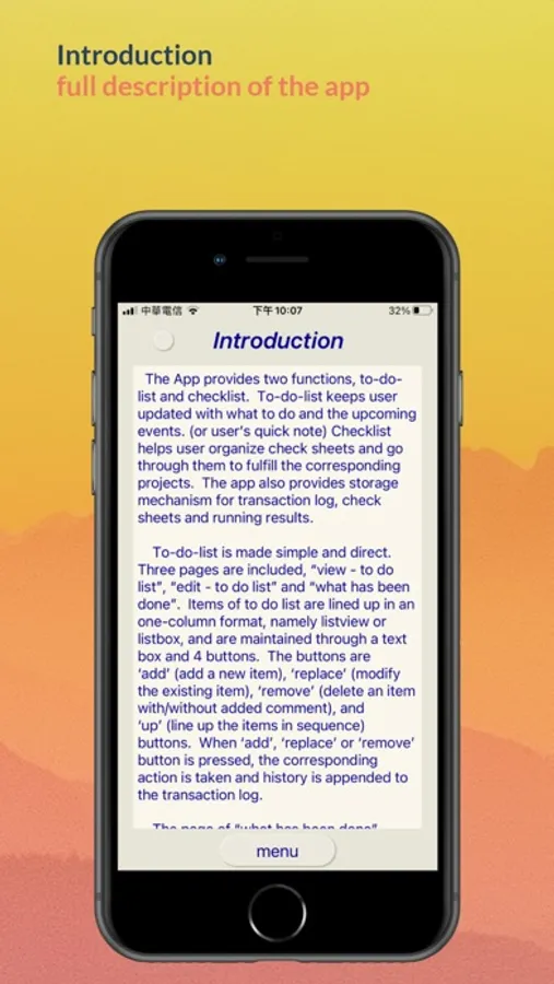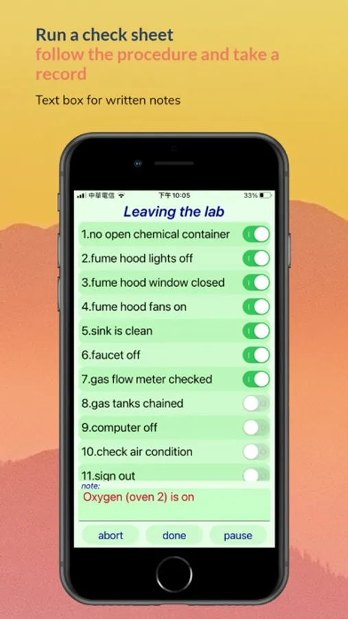 The App provides two functions, to do list and checklist. To do list keeps user updated with what to do and the upcoming events (and user’s quick note also). Checklist helps user organize check sheets to go through and fulfill the corresponding projects. The app also provides storage mechanism for transaction log, check sheets and running results.
