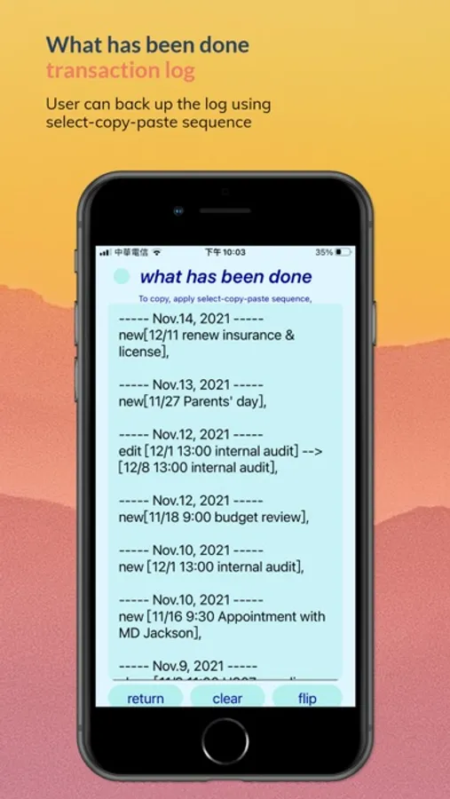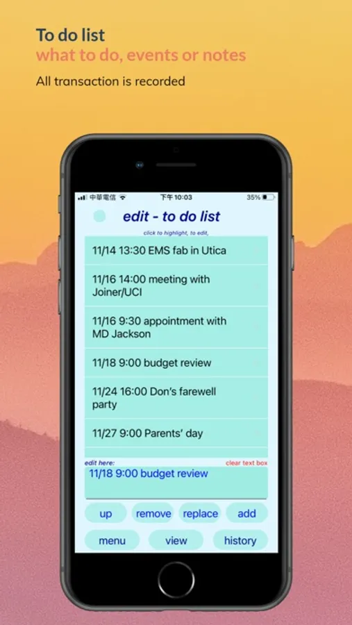 To do items are lined up in a one-column format, namely listview or listbox, and are easily maintained through a text box and 4 buttons (add, replace, remove, and up). When a button is pressed, the corresponding action is taken and history is appended to the transaction log. User can back up the transaction log onto other apps by using select-copy-paste sequence.