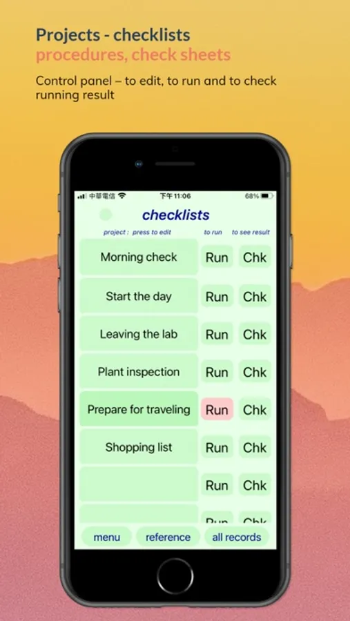 Checklist is for user to create and to run a check sheet for a project, a task, an important routine, or even a shopping list. There is a control panel for 12 projects to edit, to run, and to check (check the running proof).