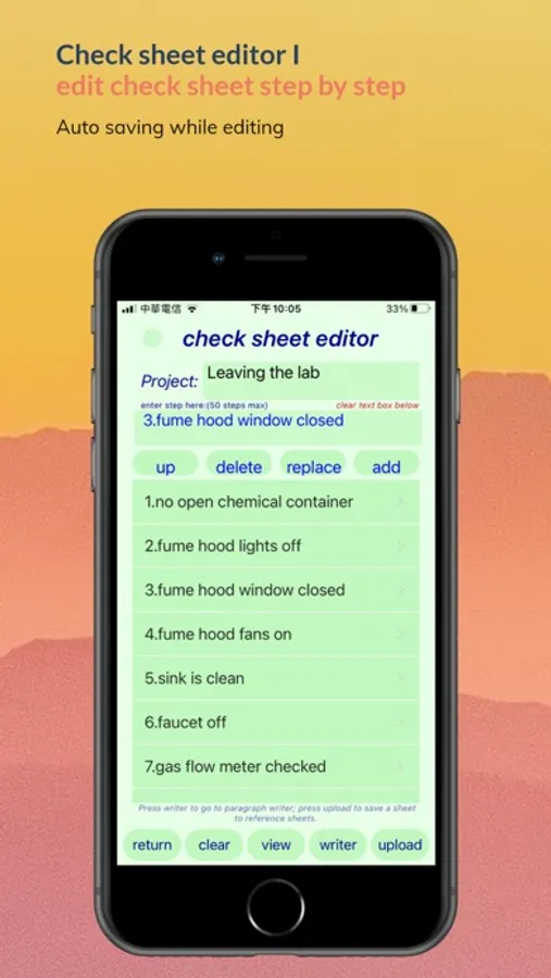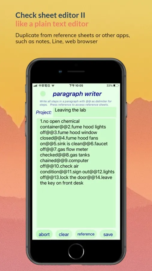 Check sheet of a project can be programmed with two editors. One, the default, adds steps one by one and auto-saves the changes instantly. The other, like writing a paragraph, puts all steps in one paragraph with @@ as the delimiter for steps. This allows user to make a copy from existing check sheets or other apps, such as Notes, Line, email.