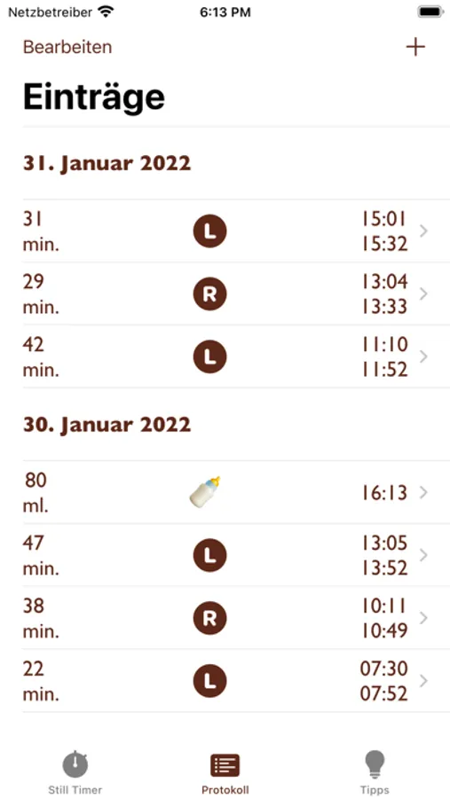 Im Protokoll hast Du einen nach Tagen sortierten Überblick über die gegebenen Mahlzeiten Deines Babys.