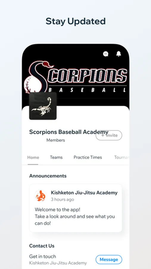 Here at the Scorpions Baseball Academy, we are excited to launch our brand new mobile app! This is a wonderful opportunity for all of our players, parents, and coaches to become even more connected and build a sense of pride in our teams and the community. Our goal is to streamline all of our communication and be as transparent as possible with all the ongoings in Scorpions Baseball! Have an awesome photo or video from a game? Share it on the app for all to see! Need to know when the next tournament is? Come check out our upcoming events page! Want to get live updates from games as they happen? Join the age group you want to follow!