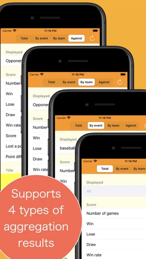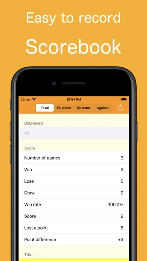 The contents entered in the score are totaled to calculate the number of wins, the number of defeats, the winning percentage, the score, the lost a point, and the point difference.