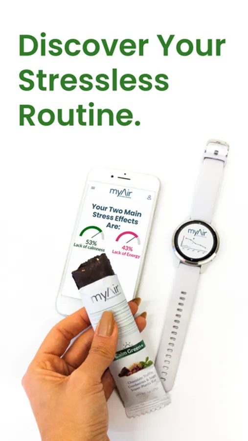 myAir provides insights on your current stress and helps you monitor and analyze your stress patterns. Our algorithm provides you with tailored insights and tools to empower you to achieve a stressless routine, based on your behavioral signature. myAir uses psychological data collected for your questionnaire along with physiological data from your smartwatch to build a personalized, nutrition-based stress relief plan just for you.