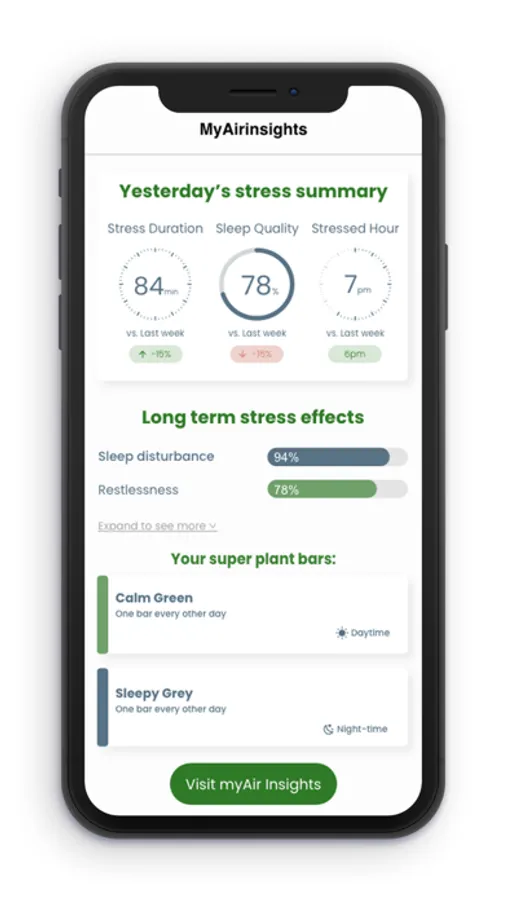 Connect your smartwatch to the myAir insights app for analysis of your stress, sleep, and other critical data. This app will open your eyes on your stress effectors and provide you with helpful tips to combat them.