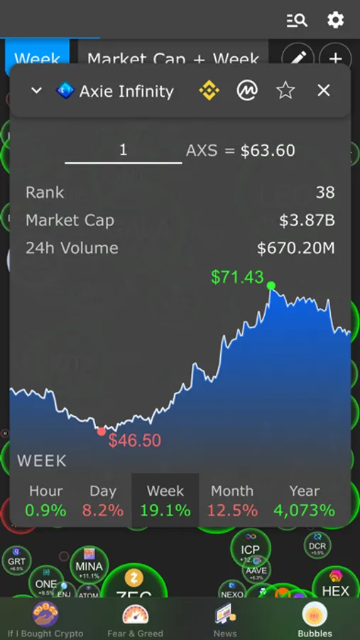In order to monitor the market the app also includes Coin Bubbles with an interactive visualisation tool for the cryptocurrency market. The 1000 biggest cryptocurrencies like Bitcoin, Ethereum and XRP are visualised each as a bubble. You can customize the size, color and content of the bubbles to whatever you like to visualize.