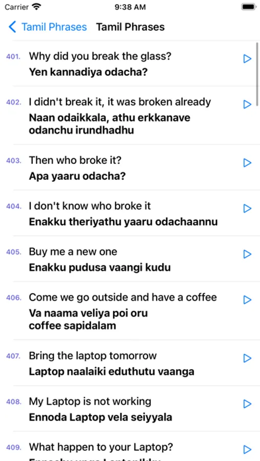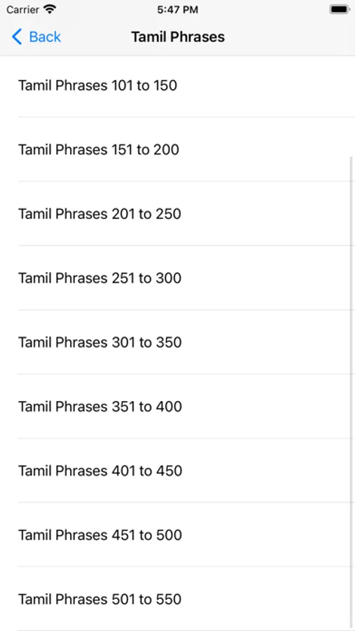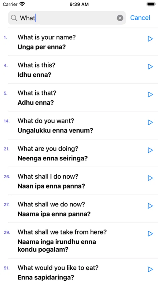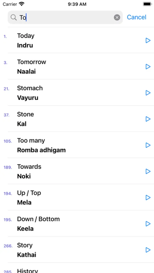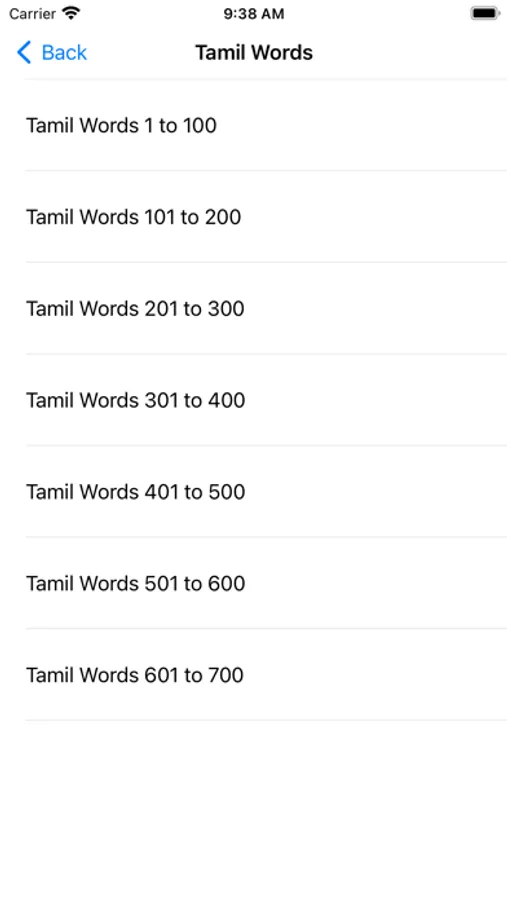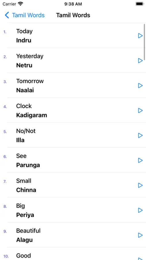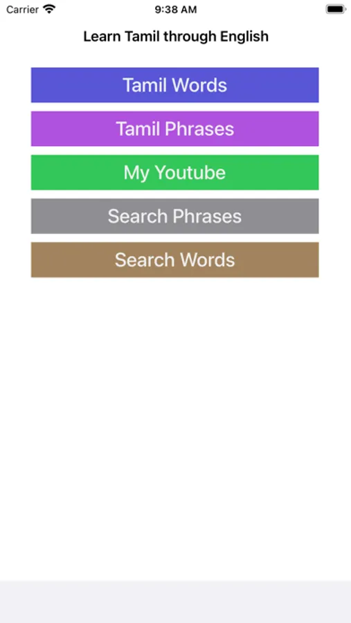 This app helps you to learn spoken Tamil through English without having to learn Tamil letters. It has 700 Tamil words & 550 daily used Tamil Phrases with audio, so you can successfully learn Tamil on your own by downloading this app.