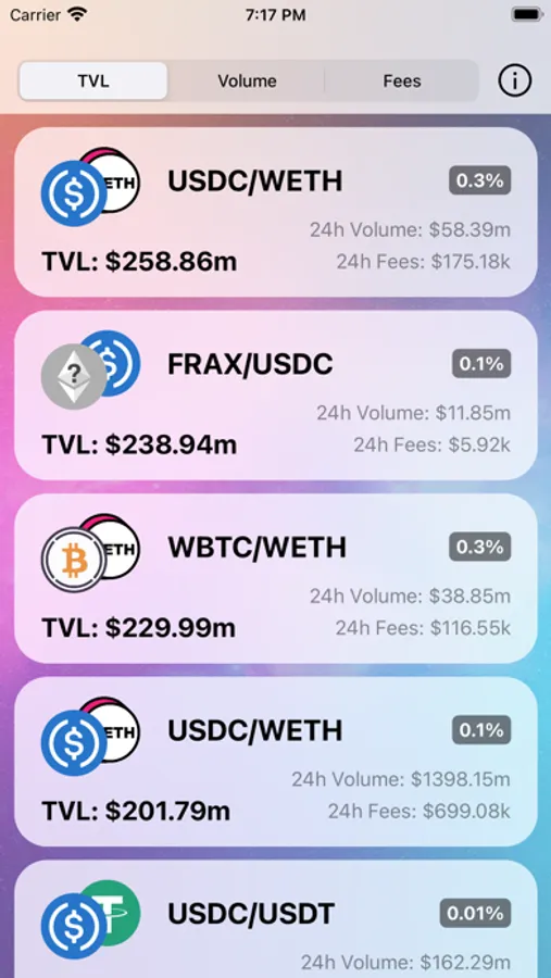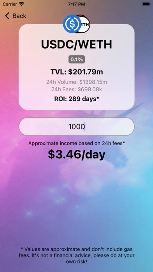 Features are: see liquidity pools data (liquidity, trading volume & fees) and approximate calculation of income based on this data.