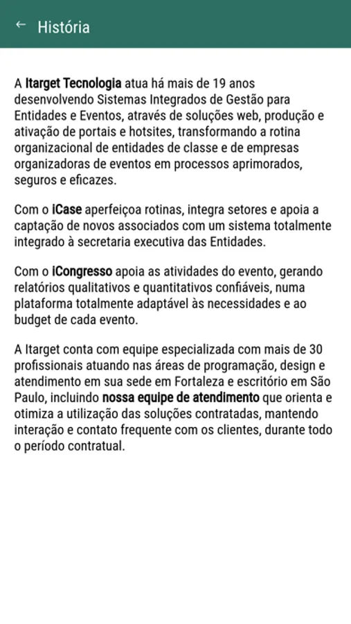 A Itarget Tecnologia atua há mais de 19 anos desenvolvendo Sistemas Integrados de Gestão para Entidades e Eventos, através de soluções web, produção e ativação de portais e hotsites, transformando a rotina organizacional de entidades de classe e de empresas organizadoras de eventos em processos aprimorados, seguros e eficazes.
