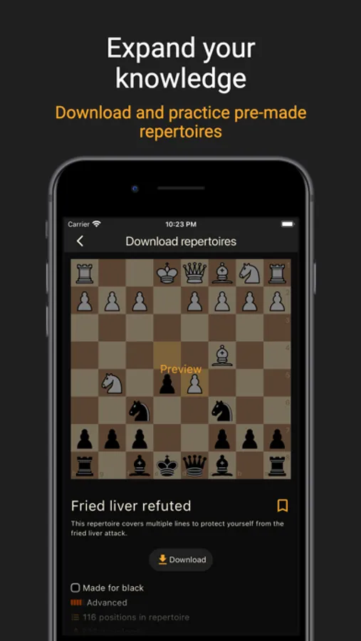 - Repertoire Training: Sharpen your memory with chess opening repertoire training. The app challenges your memory with random positions from your opening repertoire, tracking your progress and helping you master every move.