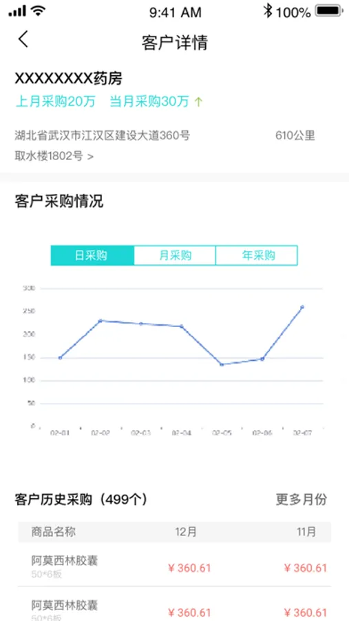 客户管理:管理业务员自己负责的客户,查看客户的采购报表,走访客户等。