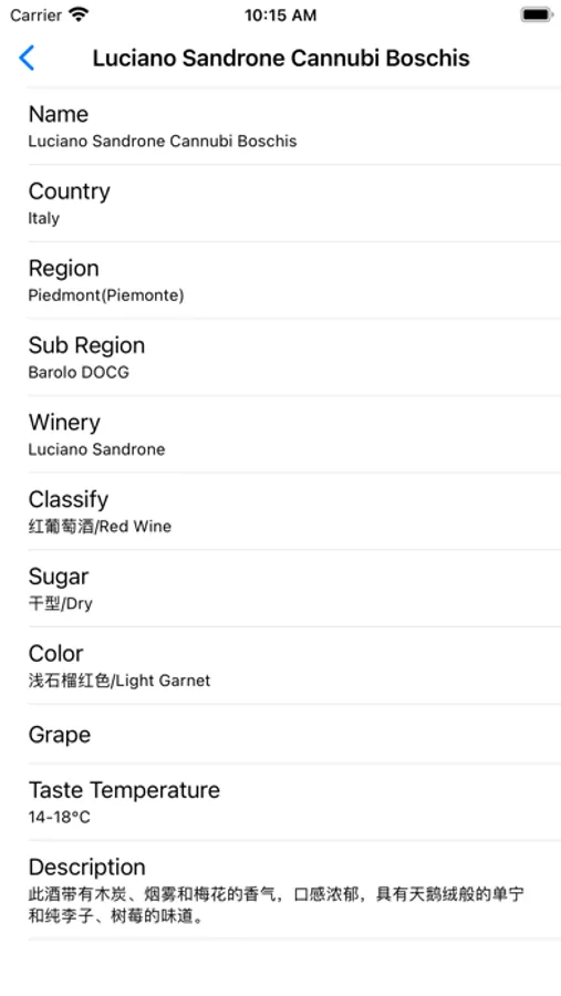 拍摄一张红酒标签,即可识别红酒名称、国家、产区、酒庄、类型、糖分、葡萄品种、酒品描述等信息。