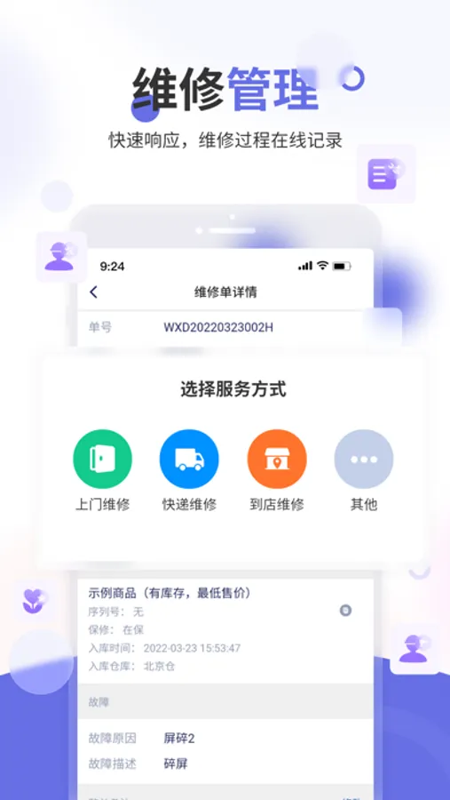 3、售后管理:安装或维修,排单清晰、费用可计;在线报修及评价,好服务让您在同行中脱颖而出;