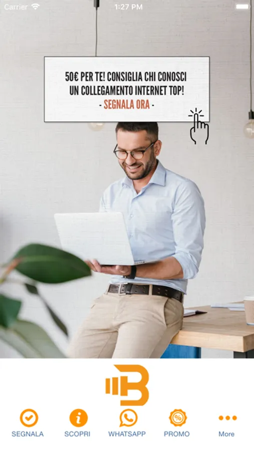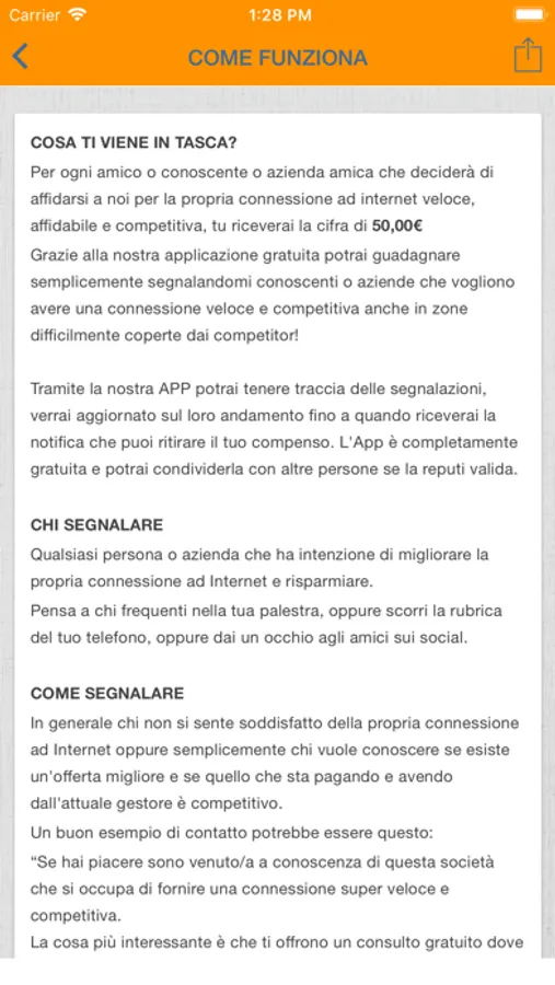 Può una semplice segnalazione farti guadagnare soldi? Grazie alla mia applicazione gratuita potrai guadagnare semplicemente segnalandomi amici e conoscenti che vogliono una connessione rapida efficace ed economica o semplificare la propria attività di professionisti Tramite la mia APP potrai tenere traccia delle segnalazioni, verrai aggiornato sul loro andamento fino a quando riceverai la notifica che puoi ritirare il tuo compenso. L'App è completamente gratuita e potrai condividerla con altre persone se la reputi valida. Sono veramente entusiasta di vederti nella mia rete di segnalatori per lavorare assieme e guadagnare assieme. Mi presento sono Boero Srl, e ci distinguiamo per correttezza e onestà.