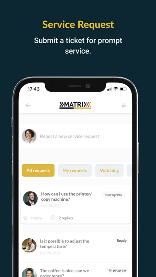 The Matrix App Exchange brings the community together and provides you with an easy way to reserve a meeting room, add a parking spot for your visitors, or create a service request. You’ll also find helpful information about the buildings and co-tenants at Matrix Innovation Center, be kept up to date about building and laboratory maintenance, as well as upcoming community events to connect with other companies.