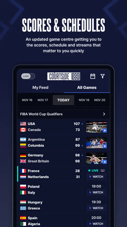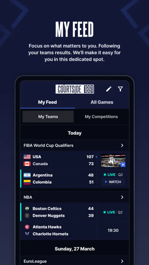 Courtside 1891 is designed to bring video and live data from professional basketball played across the globe into a single, smart destination. You can curate and choose the experience you want, so you can easily follow the sport you love from around the globe. Follow live FIBA events plus scores and results from over 150+ leagues worldwide including NBA, Liga Endesa, WNBA and 3x3. It's All Here.