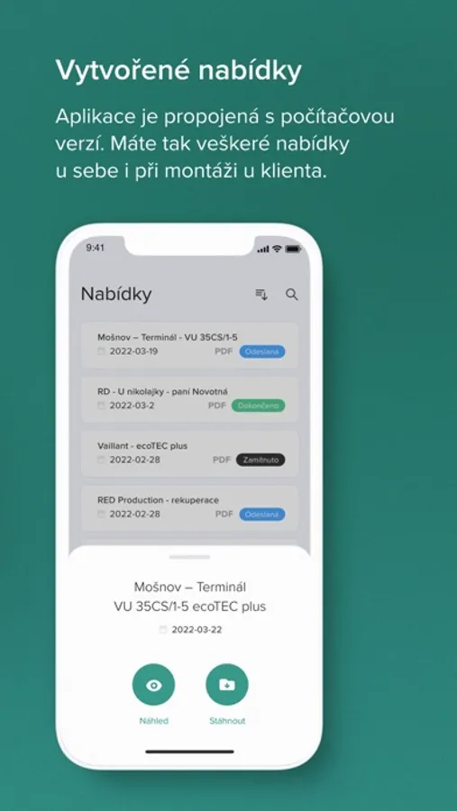 Aplikace je propojena s počítačovou verzí. Máte tak veškeré nabídky u sebe i při montáži u klienta.