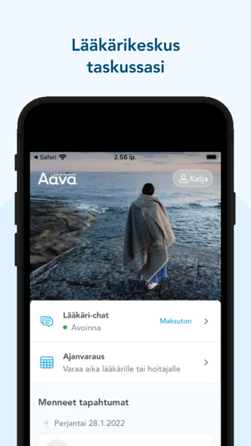 Jätä turha odottelu asiakaspalveluissa ja pankkitunnusten etsiminen taaksesi. Aavan sovelluksessa terveystietosi pysyvät ajan tasalla ja pääset jonottamatta lääkärin vastaanotolle.