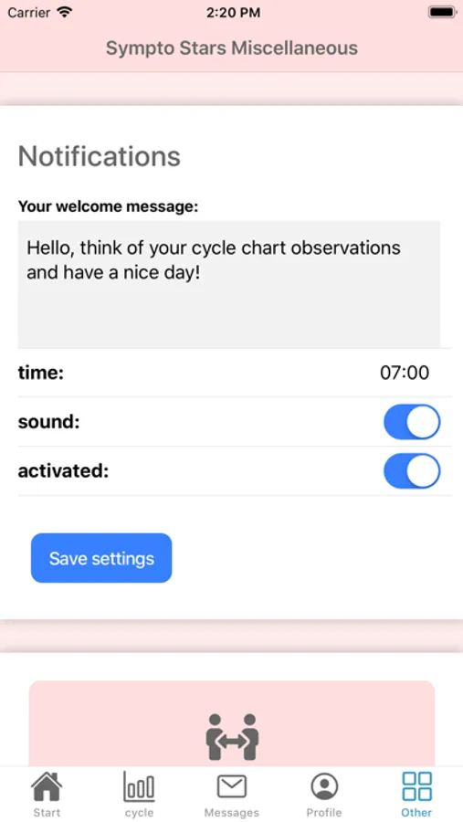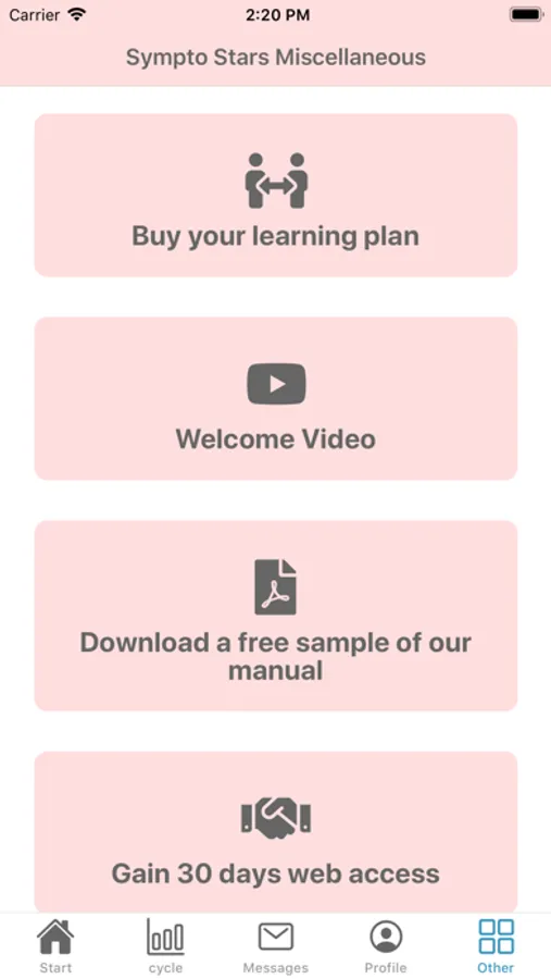 The subscription includes a 30-day trial period, including 15 days of instruction. Renews itself automatically. A valid subscription grants you access to all premium features such as the entire PDF cycle chart, message box, introduction video and the Symptothermal Manual. The subscription does not include any counseling services.