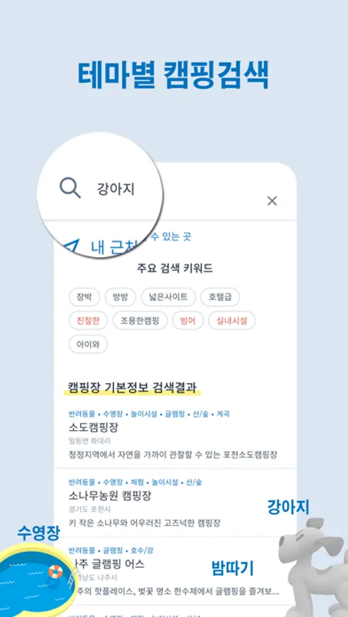 - 밤따기, 물놀이, 낚시, 등산, 자전거등 테마형 조건 별 캠핑장 검색 기능