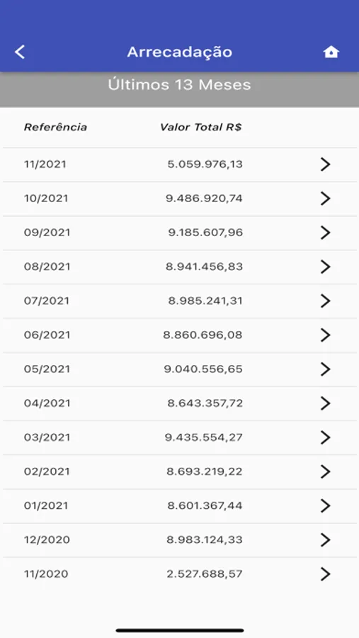 Arrecadação Mensal - Valores de arrecadação dos últimos 12 meses