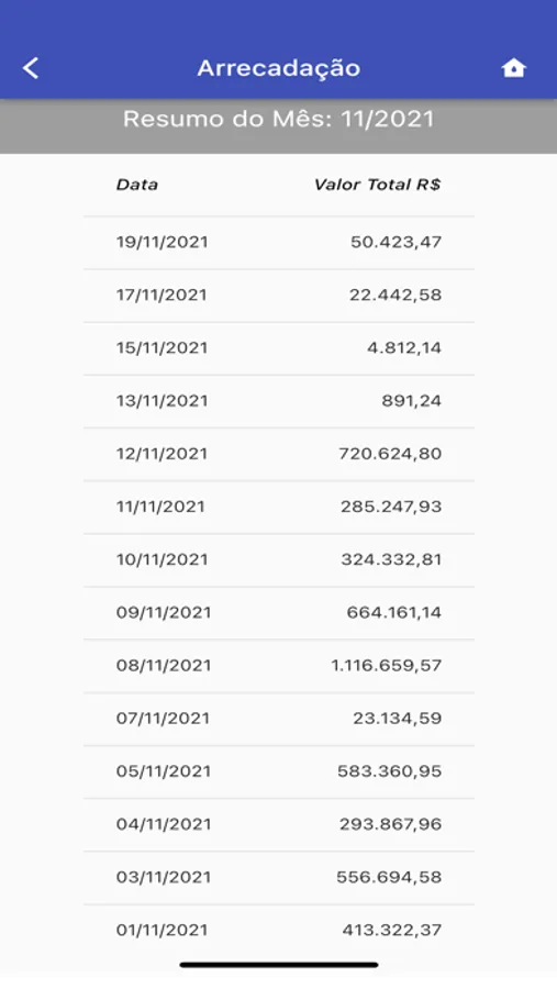 Arrecadação Diária - Valores de arrecadação por dia do mês selecionado.