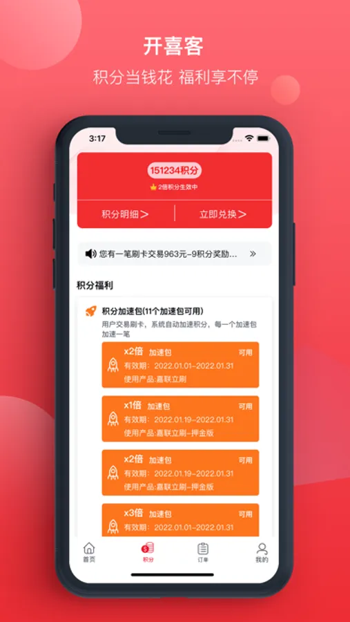 开喜客,利用积分商城+互联网,开辟全新支付平台,有效绑定商户,积分实时赠送,丰富产品免费兑换,一键包邮到家!