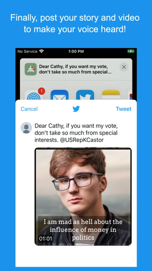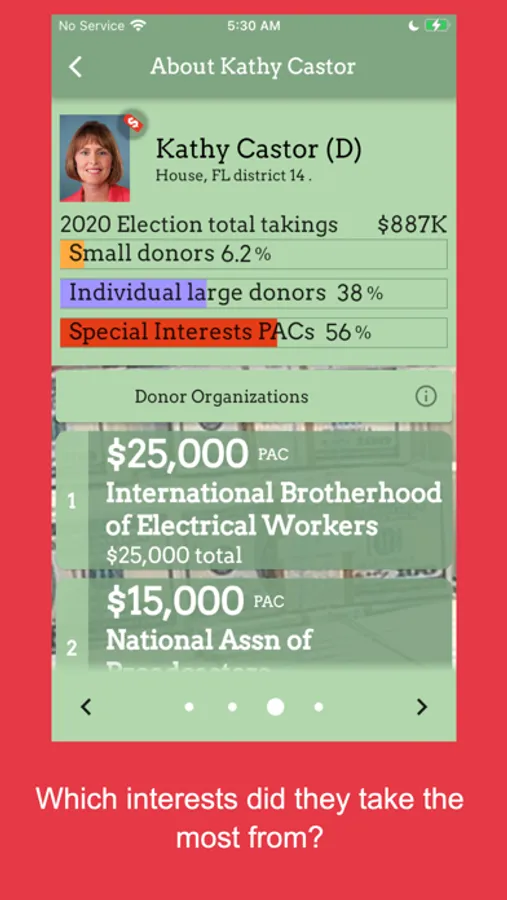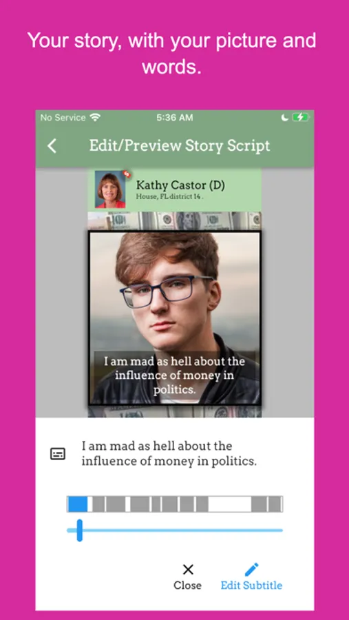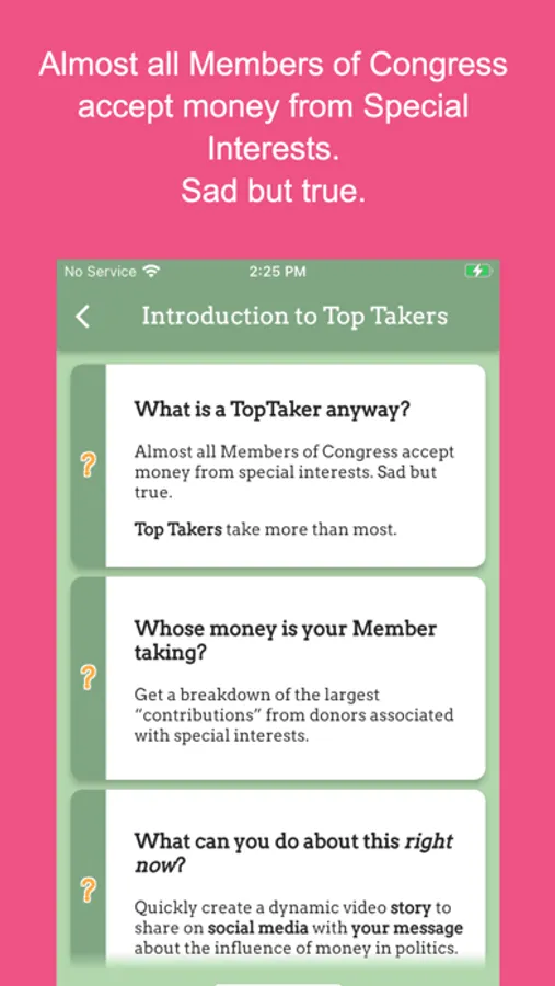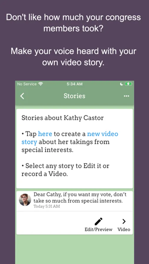 The app makes it easy to discover how much election candidates and Members of Congress take from special interests. If you don't like what you see, you can make your feelings clear by using the app to create a customized video story which includes your image and your customized script. If your candidate isn't taking much, you can create a story to congratulate them.
