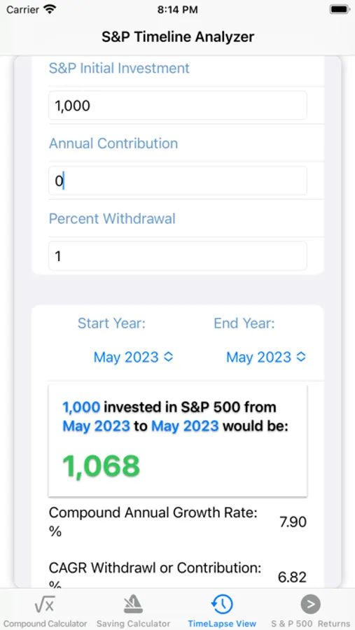 Time Lapse View of S&P Invested: This new tab allows users to select a specific year and view the value of their investment in the S&P 500 over time. By choosing the start and end years, initial investment amount, annual contribution, and percent withdrawal, users can see how their investment would have grown and the impact of withdrawals over the selected period.