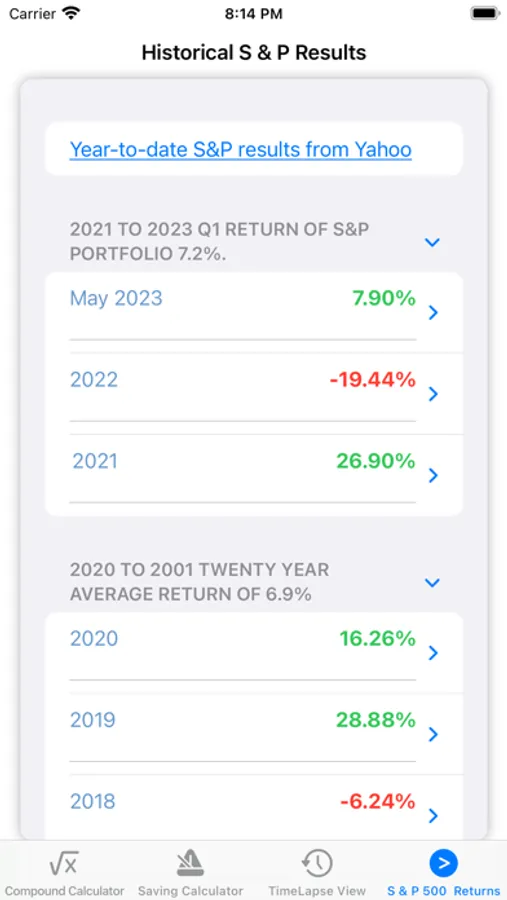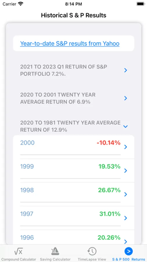 Historical S&P Returns: This tab provides access to historical data on the performance of the S&P 500 index. Users can analyze the fluctuations and trends in the stock market over time, enabling them to make informed investment decisions. This data helps users understand the variability of investing returns and select a realistic rate of return for their saving and investing goals.
