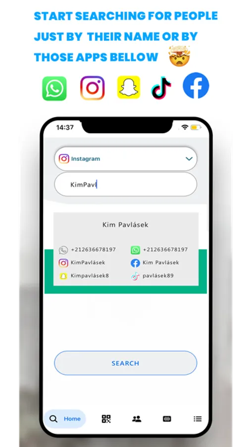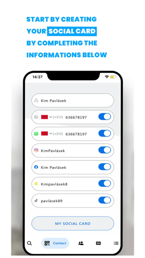 Smoothly scan a QR Code to automatically add a contact with all their profile information: Full name, Phone number, Whatsapp, Facebook, Instagram, snapshot and tiktok account link.