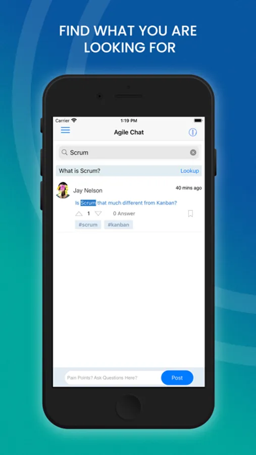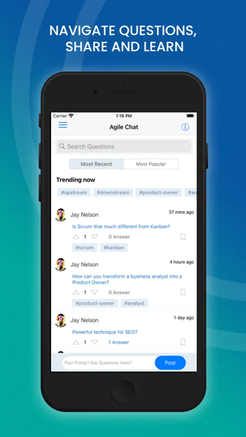 • Ask, answer, comment, share, save and vote on questions within the Agile Chat.