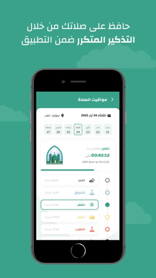 1- يمكنك من خلال التطبيق التحقق من مواعيد الصلاة في المنطقة الساكن فيها ومعرفة الوقت المتبقي للصلاة القادمة.