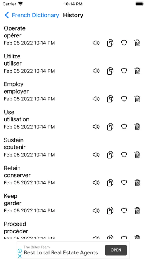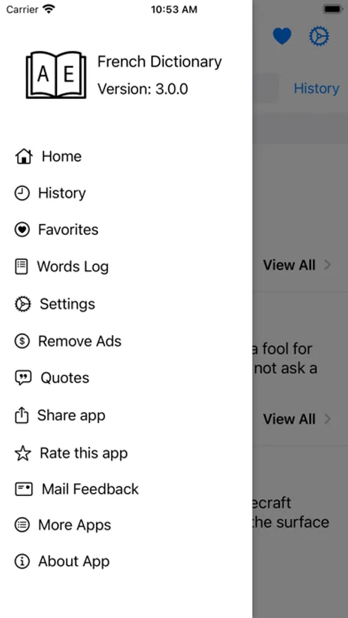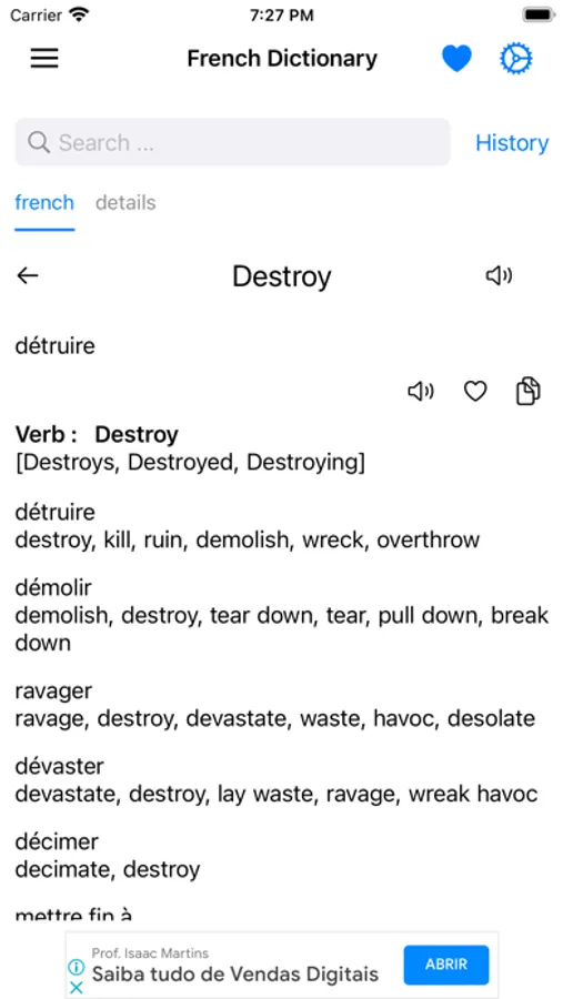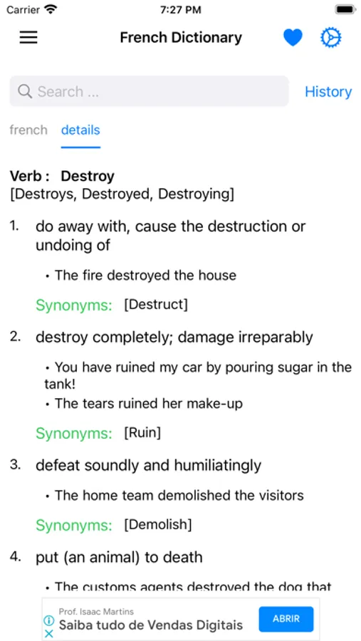 This app includes meaning of word in French, synonyms, antonyms and other advanced features