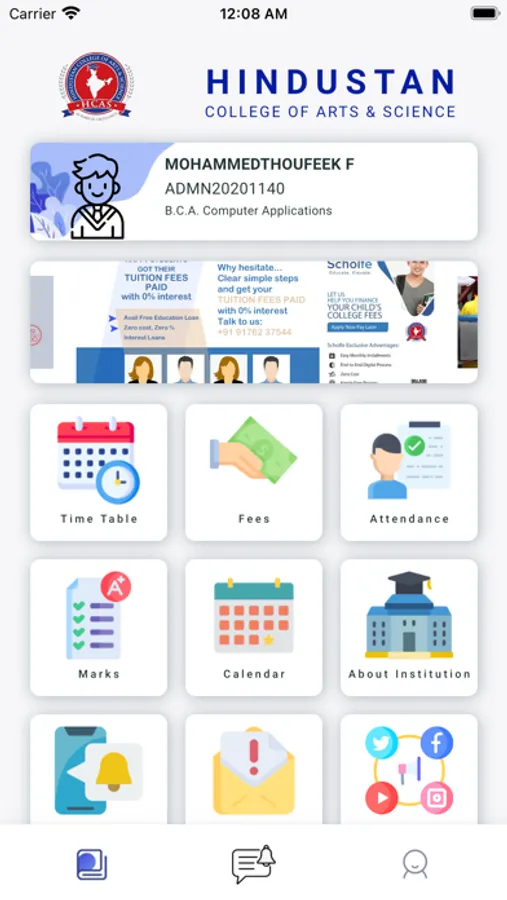 HCAS Student App contains several modules like College Calendar, Fees, Attendance, Marks, Timetable, Notifications and Social Media Connectivity.