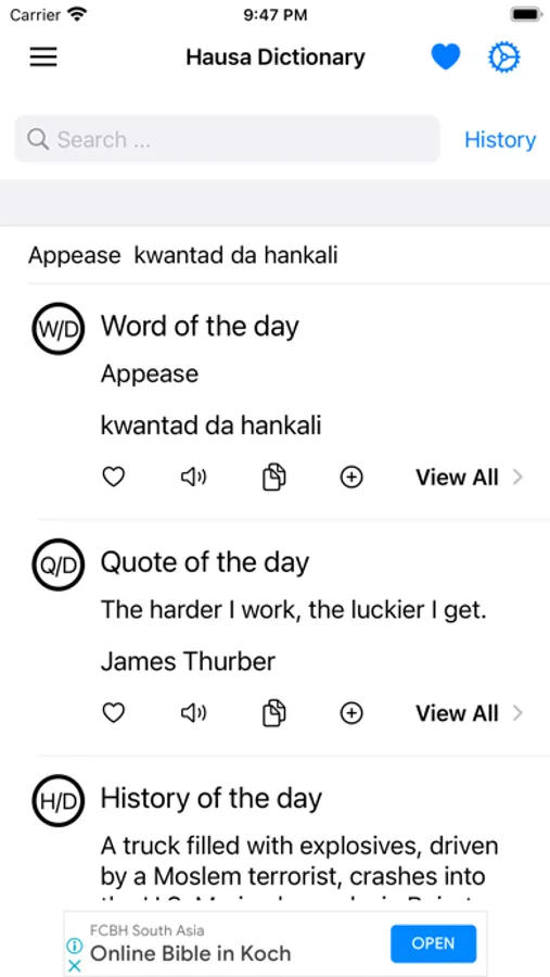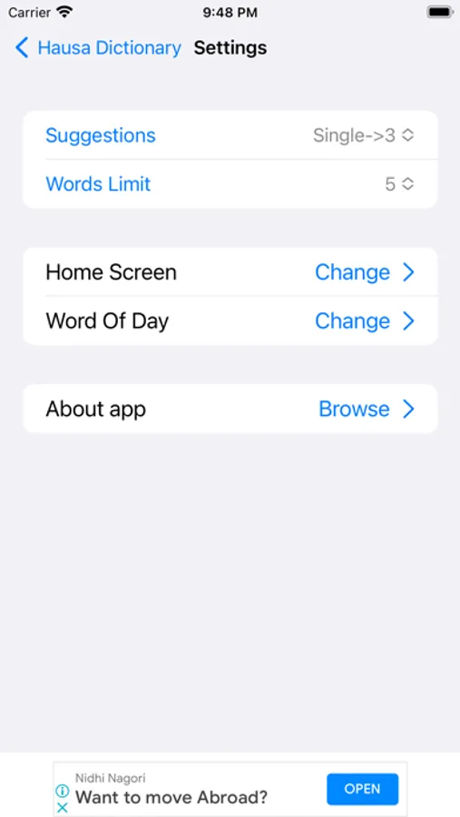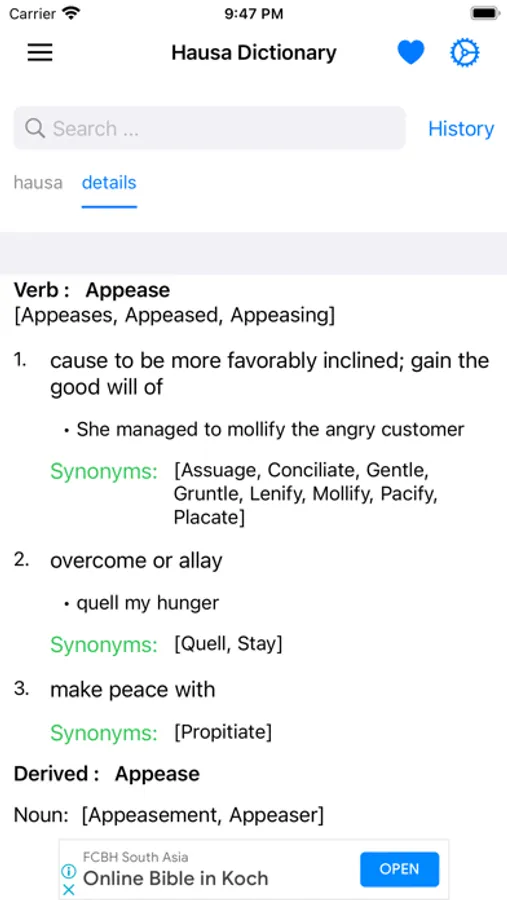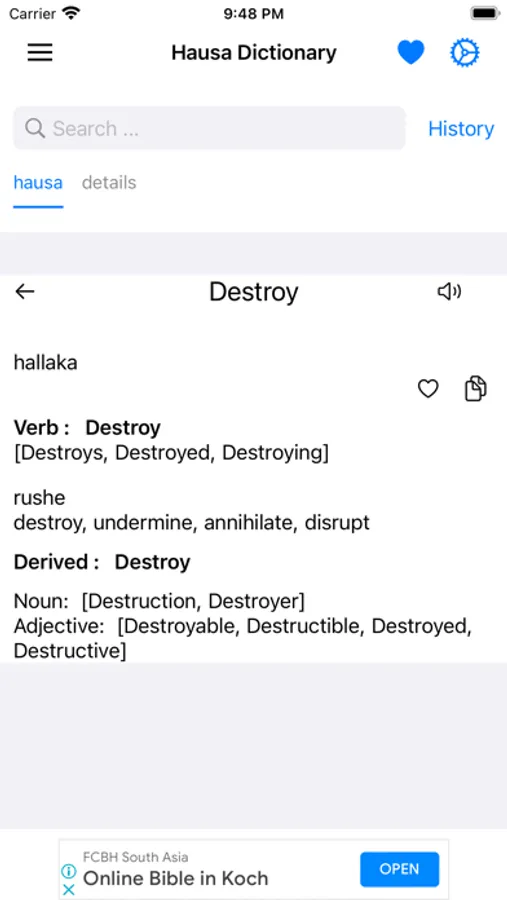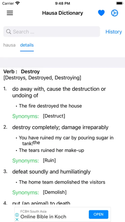 This app includes meaning of word in Hausa, synonyms, antonyms and other advanced features