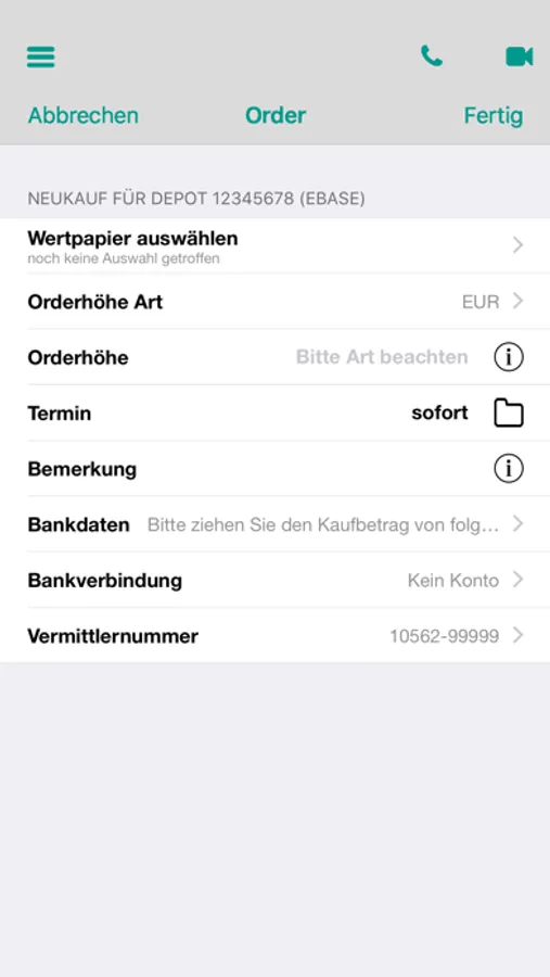 - Einreichung von Orderaufträgen direkt über die App, Bestätigung per Kennwort oder digitaler Unterschrift