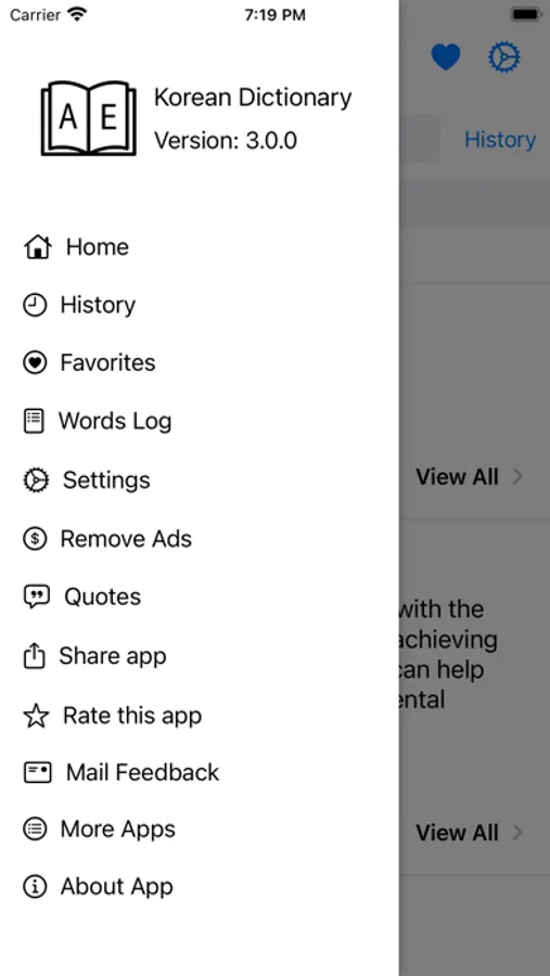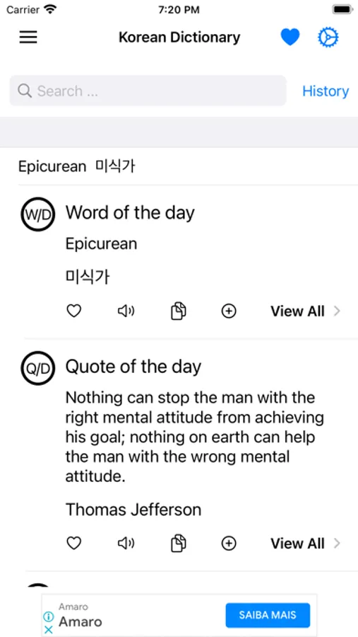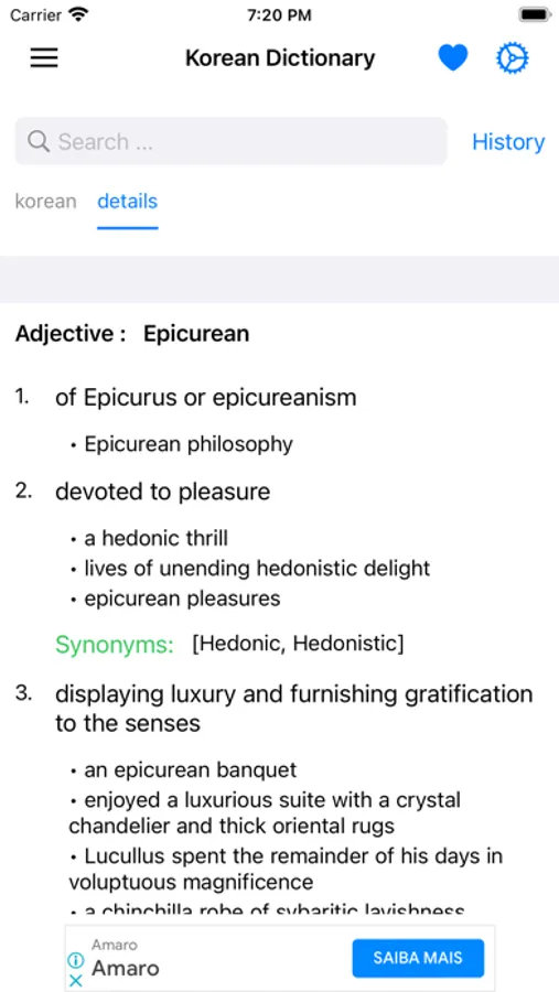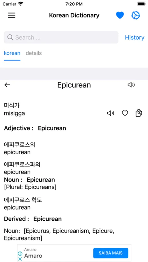 This app includes meaning of word in Korean, synonyms, antonyms and other advanced features