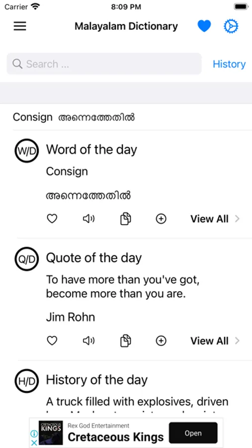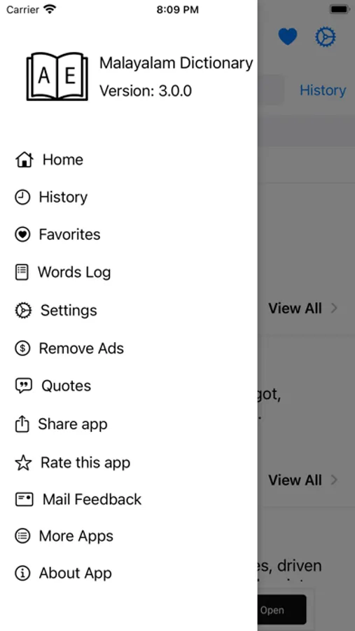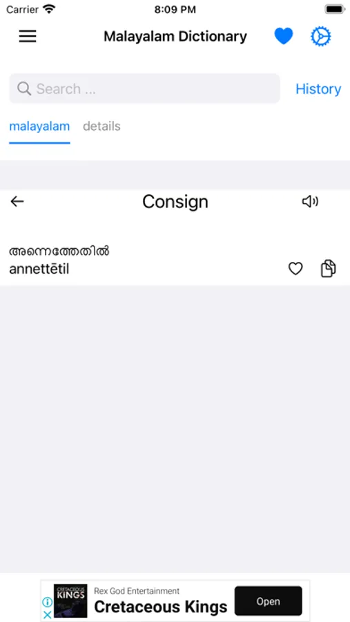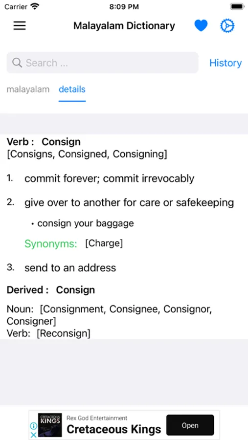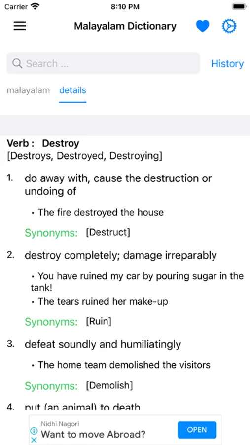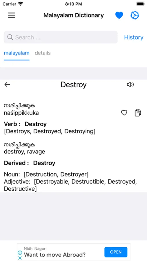 This app includes meaning of word in Malayalam , synonyms, antonyms and other advanced features
