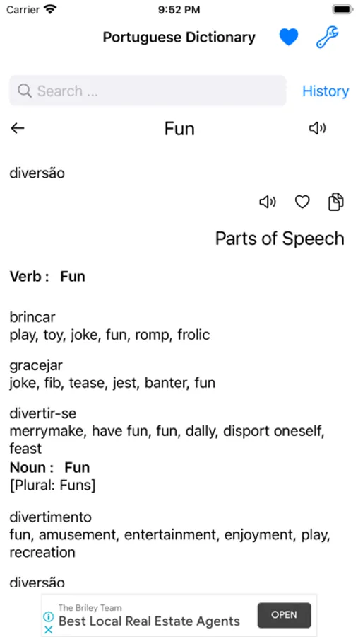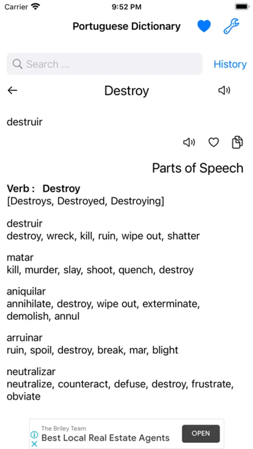 This app includes meaning of word in Portuguese, synonyms, antonyms and other advanced features