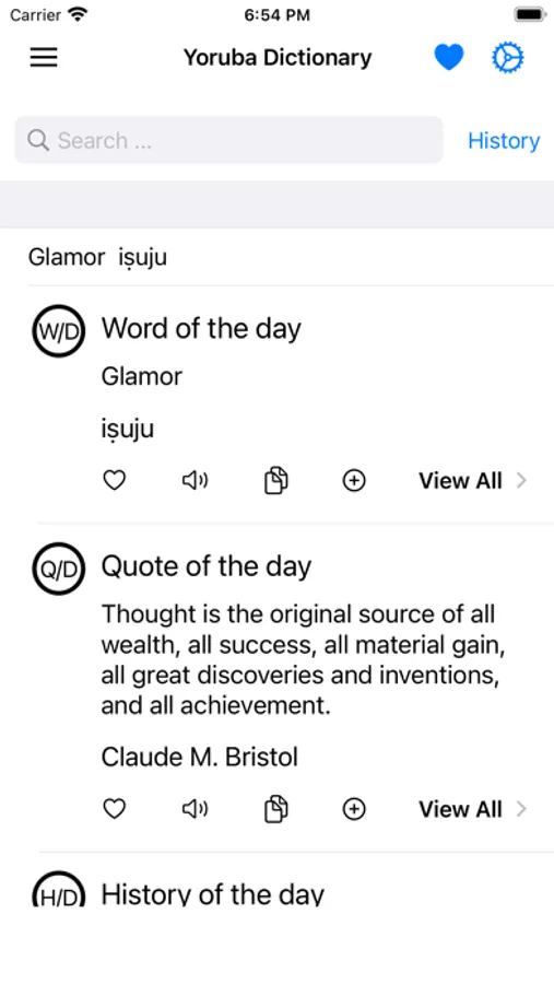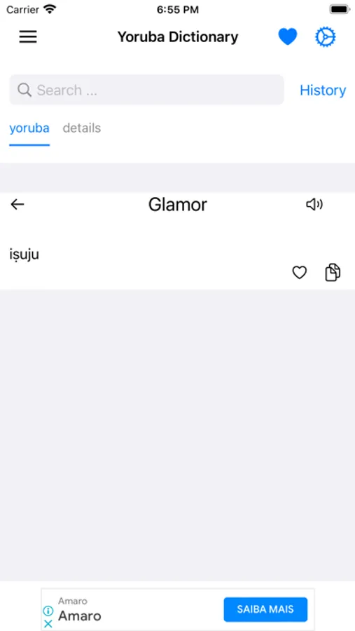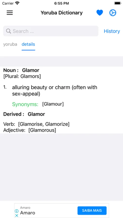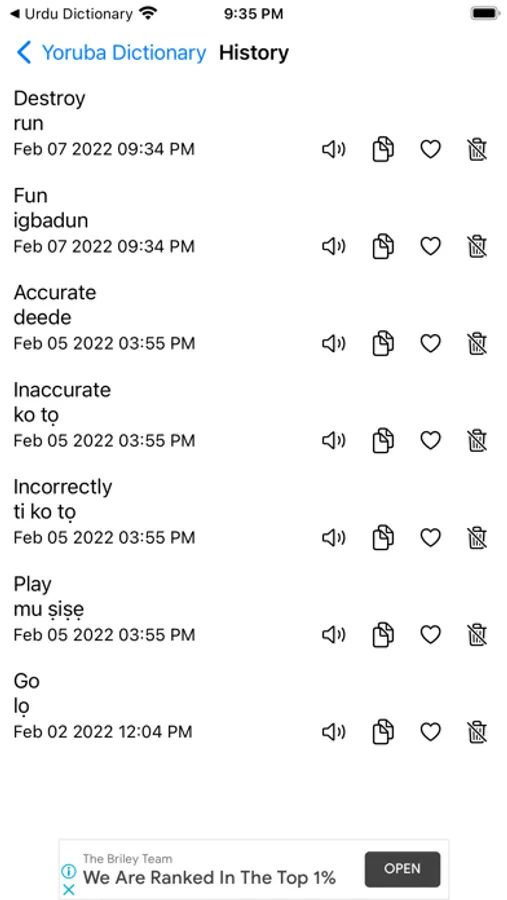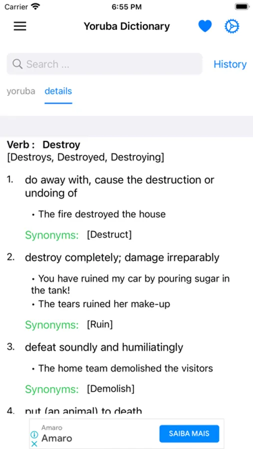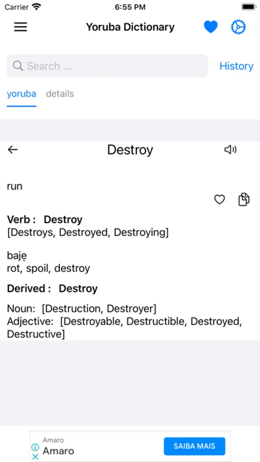 This app includes meaning of word in Yoruba, synonyms, antonyms and other advanced features